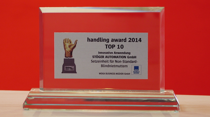 During the MOTEK trade fair from Oct. 6-9, 2014 in Stuttgart the first handling award was granted in 2 categories: One for new product developments and one for innovative application of already existing products. Our setting unit for blind rivet nuts was one of the 10 winners in this category.